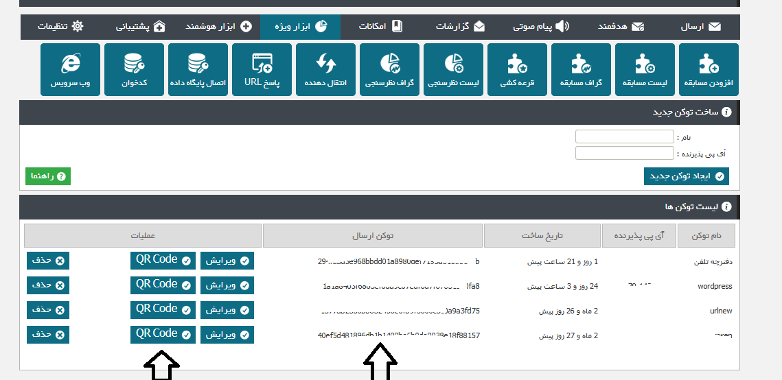 نکته برای دریافت توکن وارد پنل اس ام اس خود شده و از منوی ابزارویژه / وب سرویس روی کلید لیست توکن ها بزنید سپس در صفحه باز شده یه اسم برای توکن وارد و ای پی را خالی بزارید و کلید ایجاد را میزنید