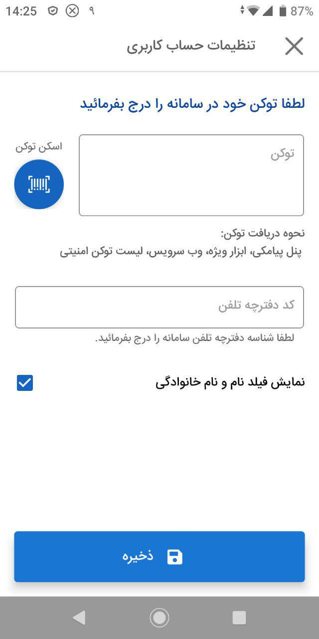 در همان بخش یک کدتوکن به شما داده میشود که میتوانید به صورت دستی وارد یا گزینه QR Code را زده و از نرم افزار اندریود دفترچه تلفن خود روبروی بخش توکن کلید اسکن توکن را زده و روبروی تصویر ایجاد شده در پنل قرار دهید